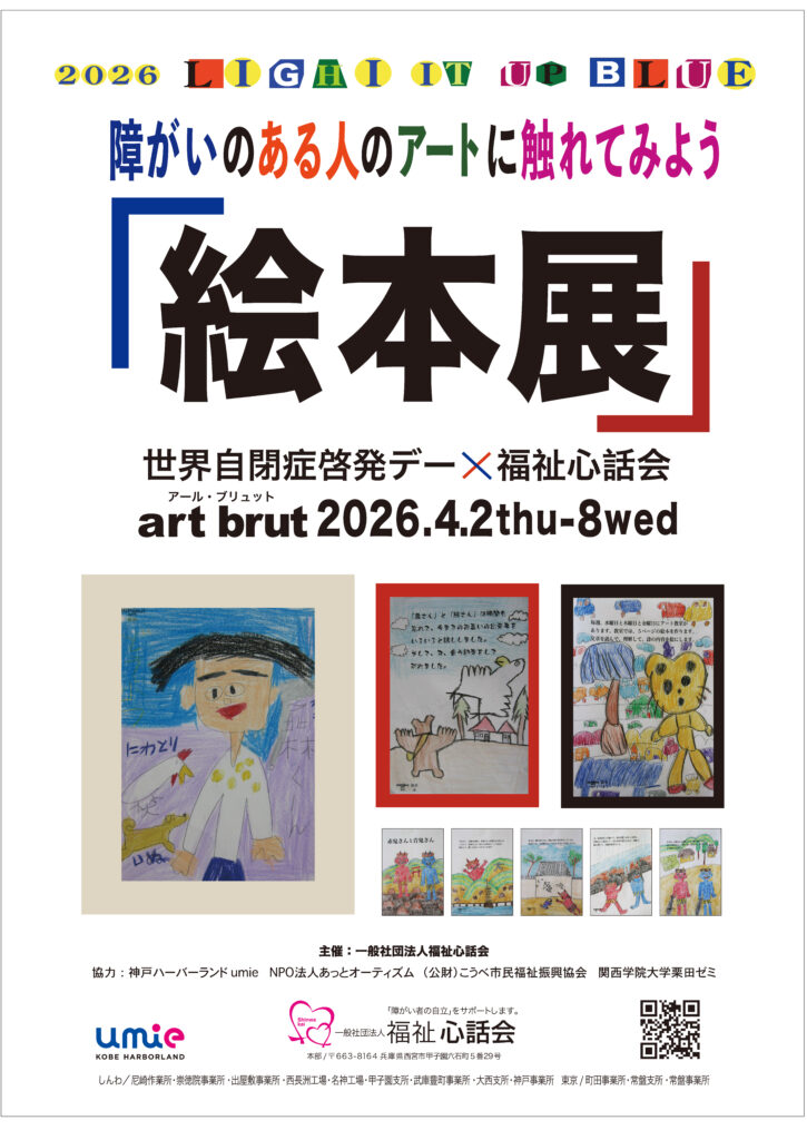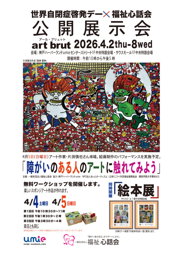 国連が定めた世界自閉症啓発デーの4月の期間に、心話会が主催の第2回障がいのある人のアートに触れてみようの公開展示会・絵本展を開催いたします。ご利用者様が日頃のアート教室で創作された作品などが展示されます。是非、ご利用者様の作品をご覧にお立ち寄りください。