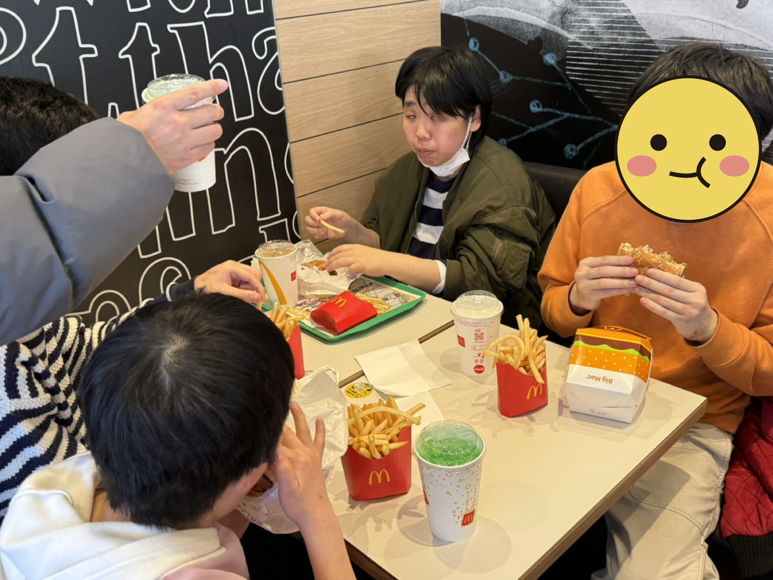 12日月曜日に西宮えびす神社へ初詣に行きました。 行く前にはマクドナルドによりハンバーガーセットを喜んで食べていました。 神社ではルールを守って静かに今年の願いことを祈っていました。